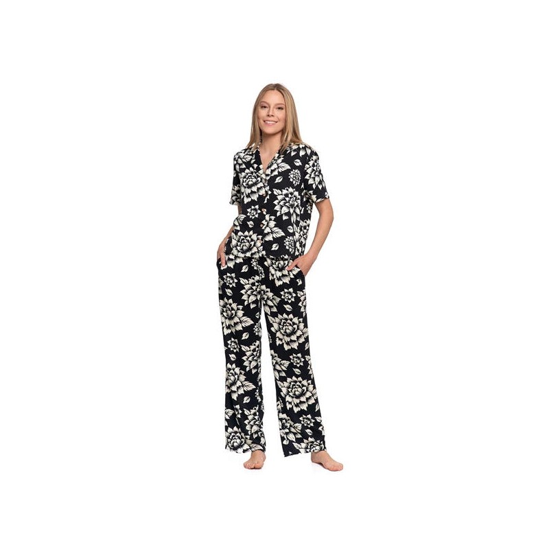 Lekka i miękka w dotyku 100% wiskoza przyjemnie otula skórę i oddycha, dzięki czemu piżama sprawdzi się przez cały rok. Zestaw tworzy koszula z krótkim rękawem, kołnierzykiem i zapięciem na guziki oraz długie spodnie z elastyczną talią.